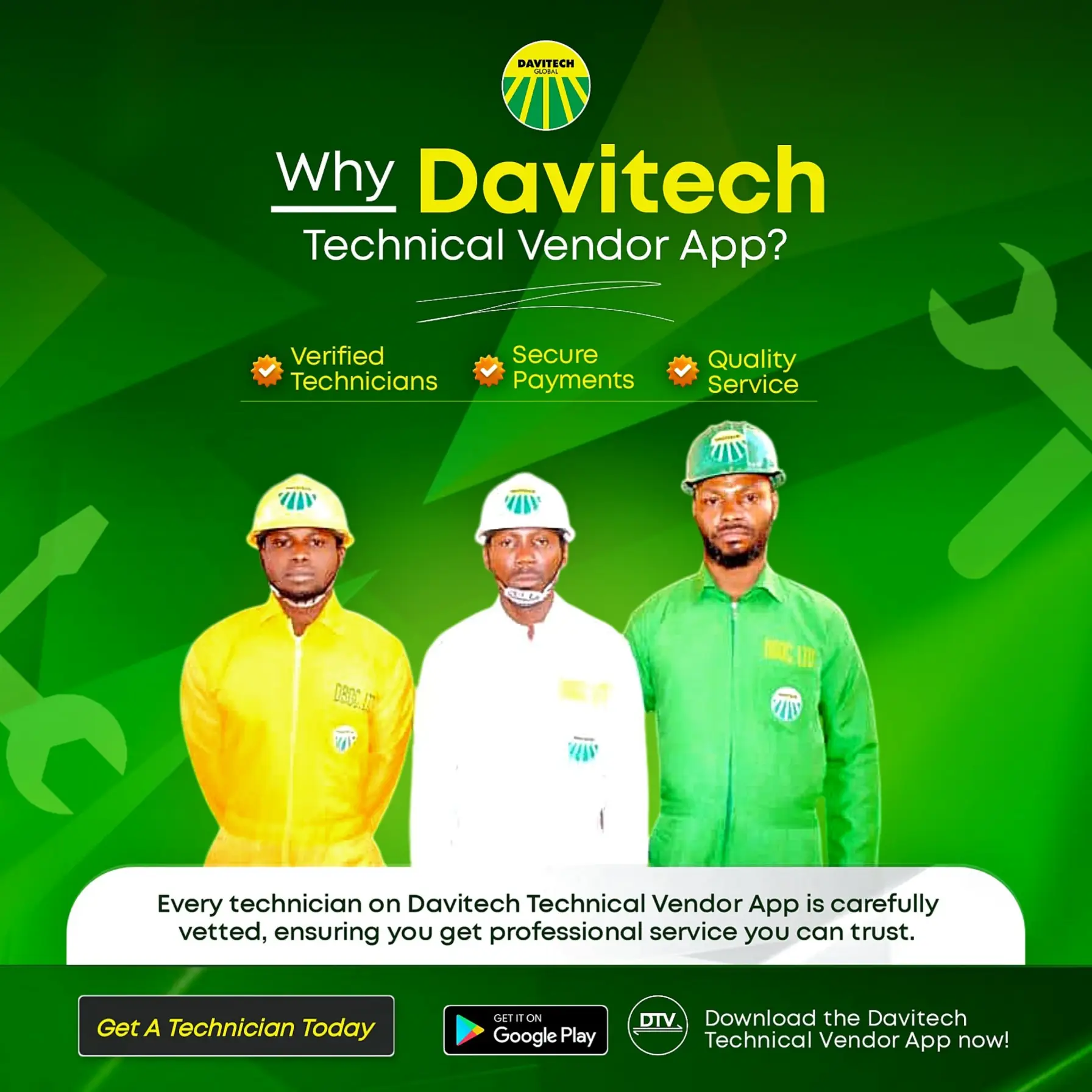 At Davitech Global, we believe in building platforms that empower people and transform communities. As we prepare to launch the DTV App—a revolutionary solution connecting skilled technical vendors with customers across Nigeria and beyond—we are opening up exclusive investment opportunities for forward-thinking partners.